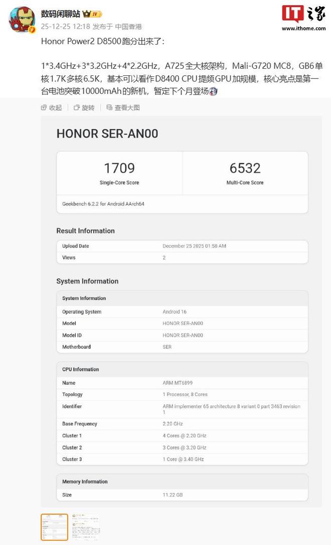 12 月 25 日消息,型号为 SER-AN00 的新机跑分已公布:单核 1709、多核 6532,博主 @数码闲聊站 今日发文称,该机为荣耀 Power2,搭载“D8500”处理器,核心亮点是第一台电池突破 10000mAh 的新机,暂定下个月登场。