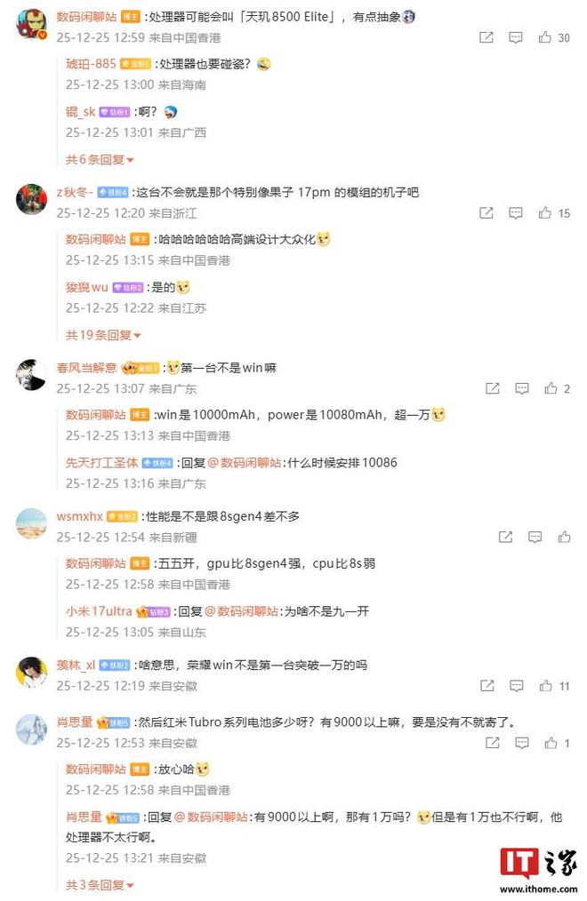 博主还补充称,这款处理器可能会叫「天玑 8500 Elite」。针对第一台电池突破 10000mAh 的新机这一说法,博主解释称:“WIN 是 10000mAh,Power 是 10080mAh,超一万。”