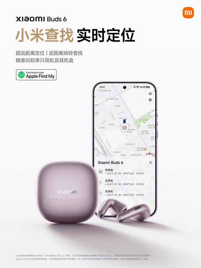 12月29日消息,小米智能生态官方微博今日发文对小米Buds 6的查找功能进行介绍。这是小米耳机史上首次支持小米查找、实时定位功能,且支持连入苹果Apple Find My,做到“双平台防丢”。