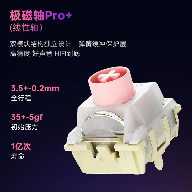 该系列键盘搭载线性手感的极磁轴 Pro+ 轴体,初始压力 35±5gf、全行程 3.5±0.2mm、寿命 1 亿次;键帽为顶部雾面处理的透光 PC 材质,遵循原厂高度设计。
