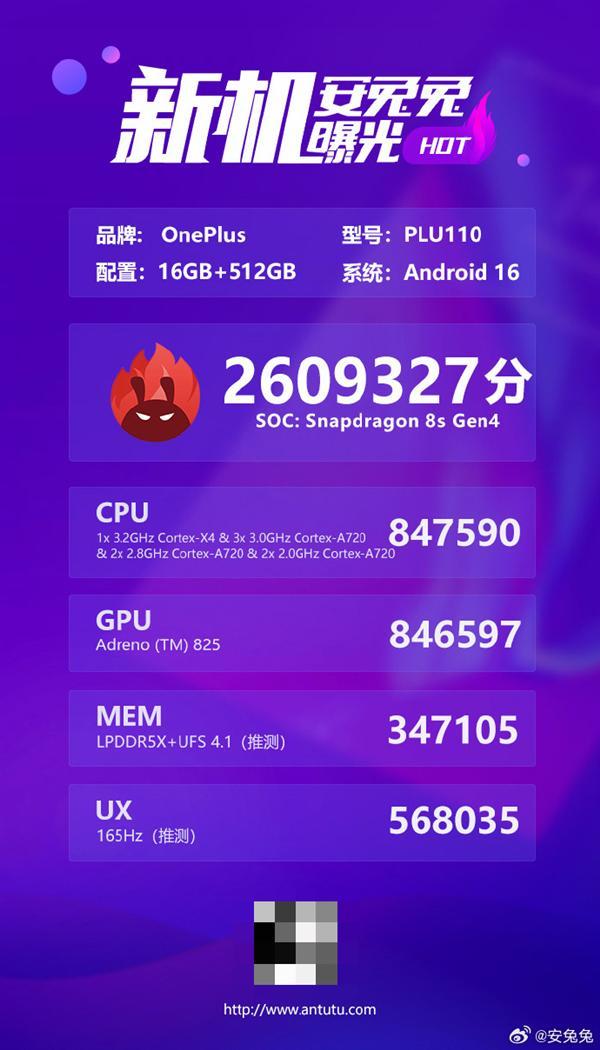 安兔兔跑分显示,一加Turbo 6将搭载骁龙8s Gen4,拥有16GB+512GB存储规格。