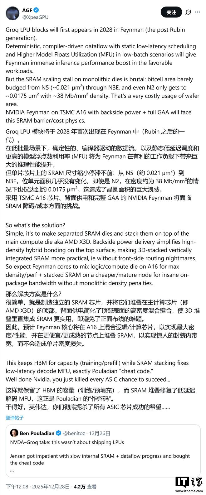GPU 领域专家 AGF 于 12 月 28 日在 X 平台分析预测,Feynman GPU 将借鉴 AMD 在 X3D 处理器上的成功经验,极有可能采用台积电先进的 SoIC(系统整合芯片)混合键合技术,实施 3D 堆叠设计。