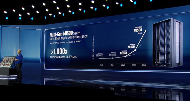 AMD 承诺 Instinct MI500 系列将带来显著的 AI 性能提升。该公司正朝着在 4 年内实现超过 1000 倍 AI 性能的目标迈进。MI500 系列将于 2027 年推出。