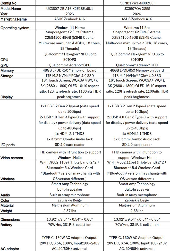 1 月 7 日消息,科技媒体 Wccftech 今天(1 月 7 日)发布博文,报道称在 CES 2026 展会期间,华硕推出 Zenbook A16(UX3607),声称是迄今为止“速度最快、性能最强”的骁龙笔记本电脑。