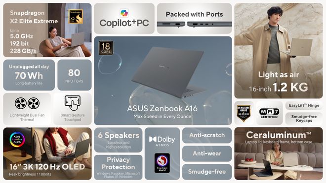 ZenBook A16 采用防刮擦、防磨损、防指纹设计,并内置 6 个扬声器(支持杜比全景声)。系统采用双风扇轻量化散热方案,运行安静高效,标准配置的笔记本电脑重量为 1.2 公斤。