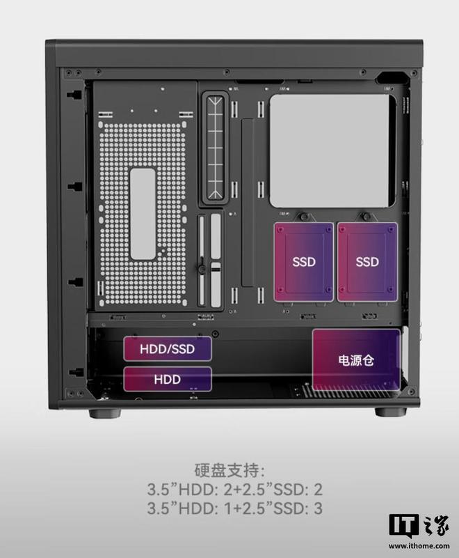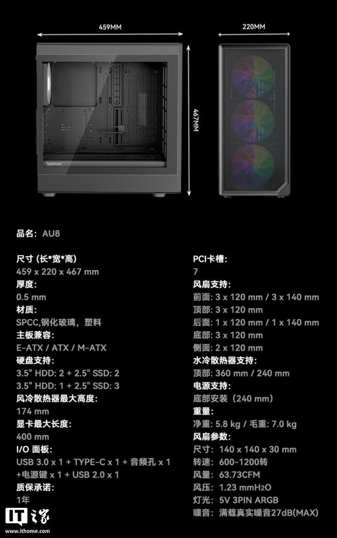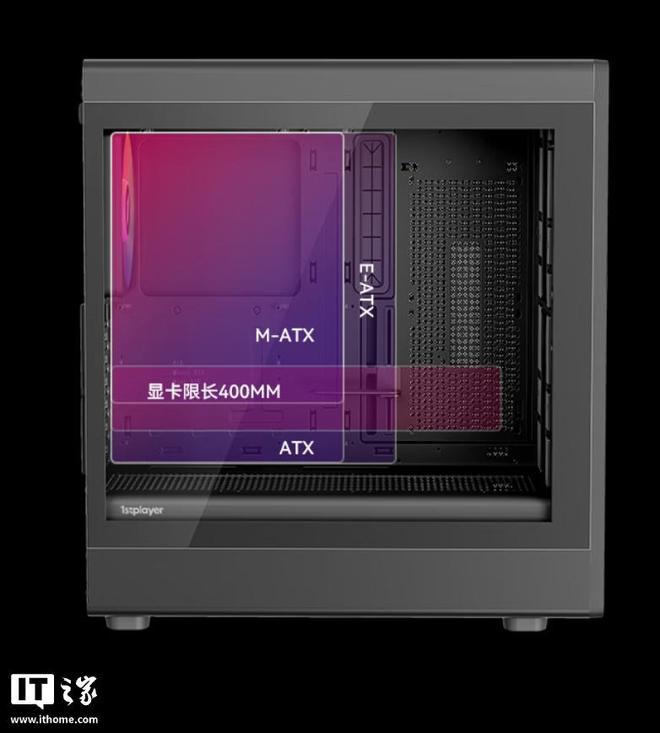 兼容性方面,该机箱支持 E-ATX 规格主板,提供 7 个 PCI 全高扩展槽,可容纳 2 个 3.5 寸 +2 个 2.5 寸硬盘或 1 个 3.5 寸 +2 个 2.5 寸硬盘,其中 CPU 散热器限高 174mm,显卡最大限长 400mm(预装显卡支架),电源最大限长 240mm。