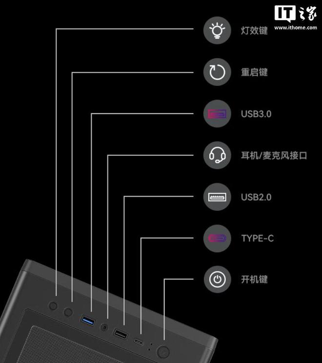 该机箱整体尺寸 459 x 220 x 467mm,正面板配备 Mesh 散热网口,侧面板采用透明设计,顶部提供了 1 个 3.5mm 音频接口、1 个 USB-A 2.0 接口、1 个 USB-A 3.0 接口、1 个 USB-C 接口。