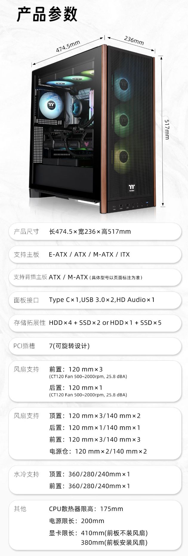 系列机箱整体尺寸为 474.5 x 236 x 517mm,侧面采用透明设计,两侧和前面板均支持快拆。机箱前置 1 个 3.5mm 音频接口、2 个 USB-A 3.0 接口、1 个 USB-C 接口。