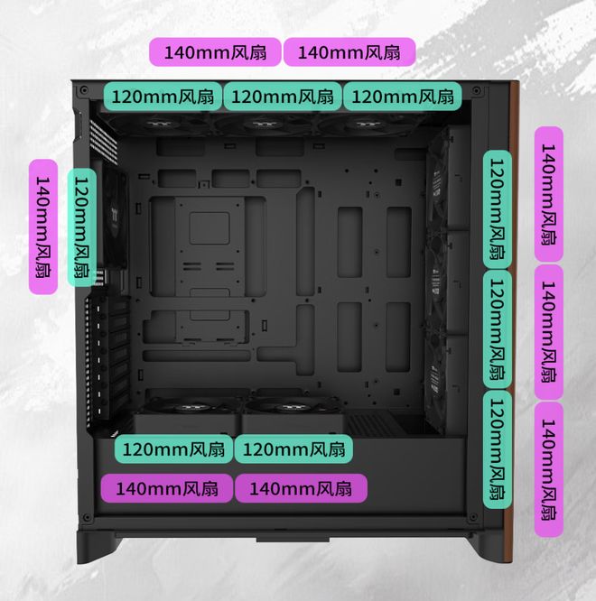该机箱标配 4 把 120mm 风扇,转速范围设定为 500~2000 RPM,最大风量静压分别可达 57.05 CFM 和 2.23 mmH2O,最大噪音值为 25.8 分贝。除此之外,机箱前面板可安装 3 把 120mm/140mm 风扇,尾部可安装 1 把 120mm/140mm 风扇,顶部可安装 3 把 120mm/2 个 140mm 风扇,电源舱顶部可安装 2 把 120mm/140mm 风扇。