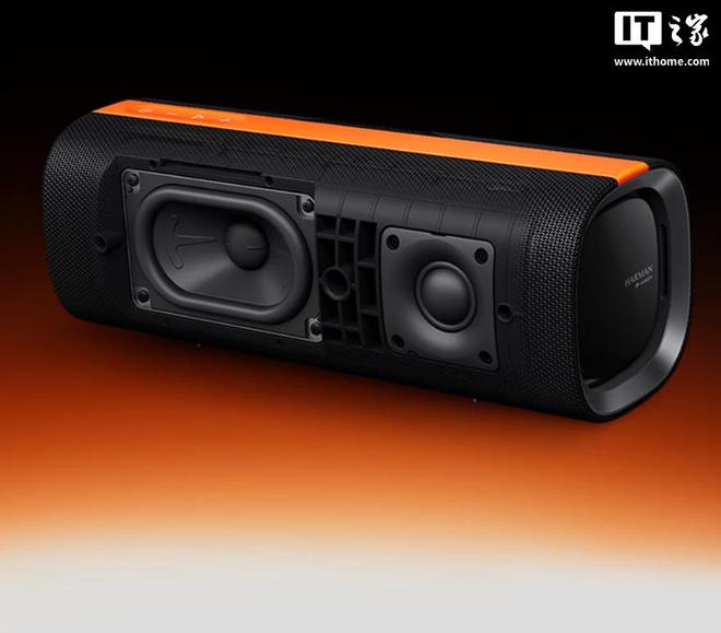 该音箱外观采用黑橙撞色,整体设计较为简约,带有隐藏式把手,音箱支持 IP67 认证,音箱侧面提供了 3D 幻彩灯光效果。