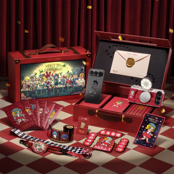 该机堪称联名天花板,机身背部印有经典的MOLLY小画家图案,并配备旅行箱造型的精致礼盒,礼盒正面印有MOLLY 20周年形象。