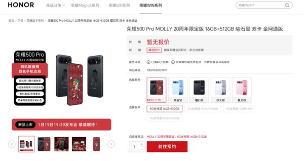 目前,荣耀500 Pro MOLLY 20周年限定版已在荣耀商城开启预约,提供曜石黑16GB+512GB版本。
