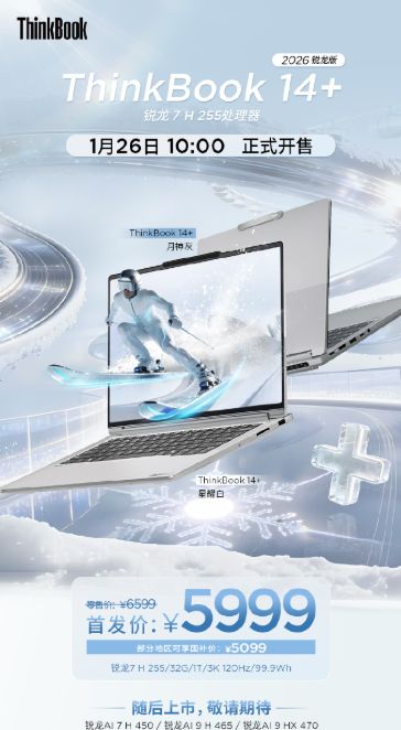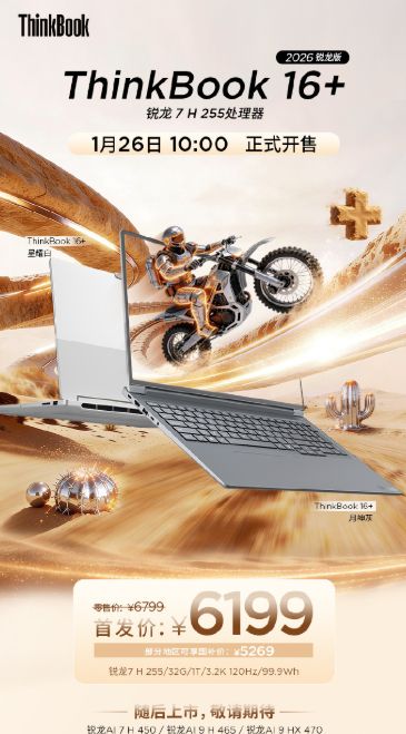 1月23日,联想官方宣布,ThinkBook+系列AMD新品将于1月26日上午10点正式发售。据官方介绍,本次发布的两款新机分别是ThinkBook14+ 2026锐龙版和ThinkBook16+ 2026锐龙版,且均采用全新模具设计。其中14+ 2026锐龙版的首发价为5999元,16+ 2026锐龙版的首发价为6199元。