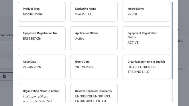 1 月 23 日消息,科技媒体 Android Headline 昨日(1 月 22 日)发布博文,报道称 vivo V70 FE 手机(型号 V2550)额定电池容量为 6870mAh,支持 55W 有线充电,并具备 IP68 级防尘防水能力。