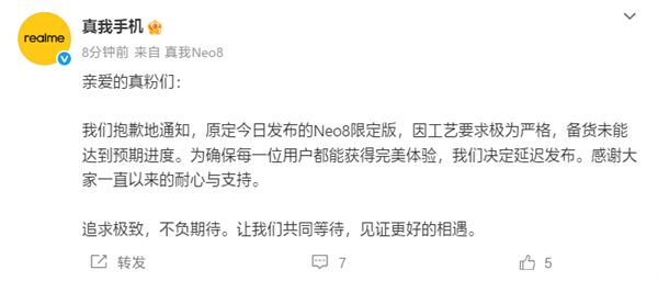 1月22日消息,真我Neo8将在今晚发布,在发布会前夕,真我宣布原定今天发布的限定版因工艺要求极为严格,备货未能达到预期进度。