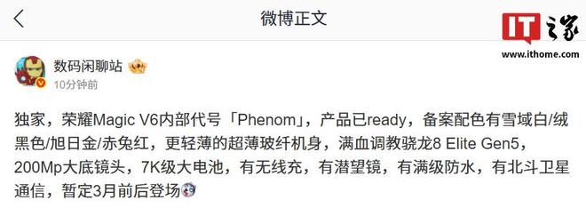 1 月 27 日消息,博主 @数码闲聊站 今日发文透露,荣耀 Magic V6 折叠屏手机内部代号「Phenom」,产品已 ready,备案配色有雪域白 / 绒黑色 / 旭日金 / 赤兔红。