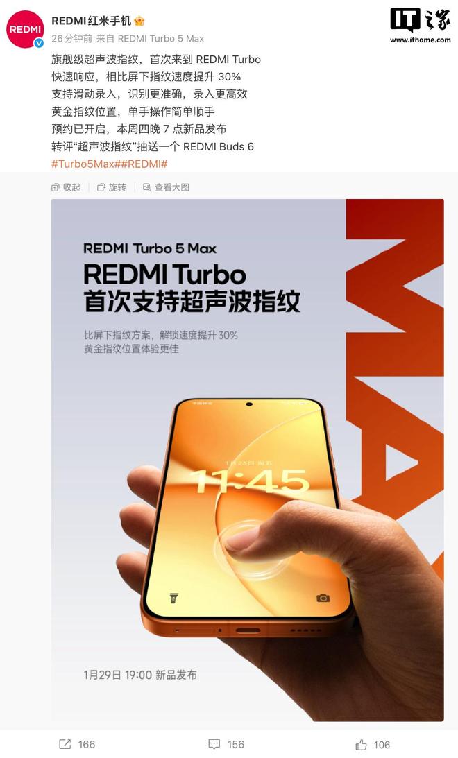 1 月 27 日消息,小米今天对旗下 REDMI Turbo 5 Max 手机进行预热,该机搭载超声波指纹,是 Turbo 系列史上第一次。