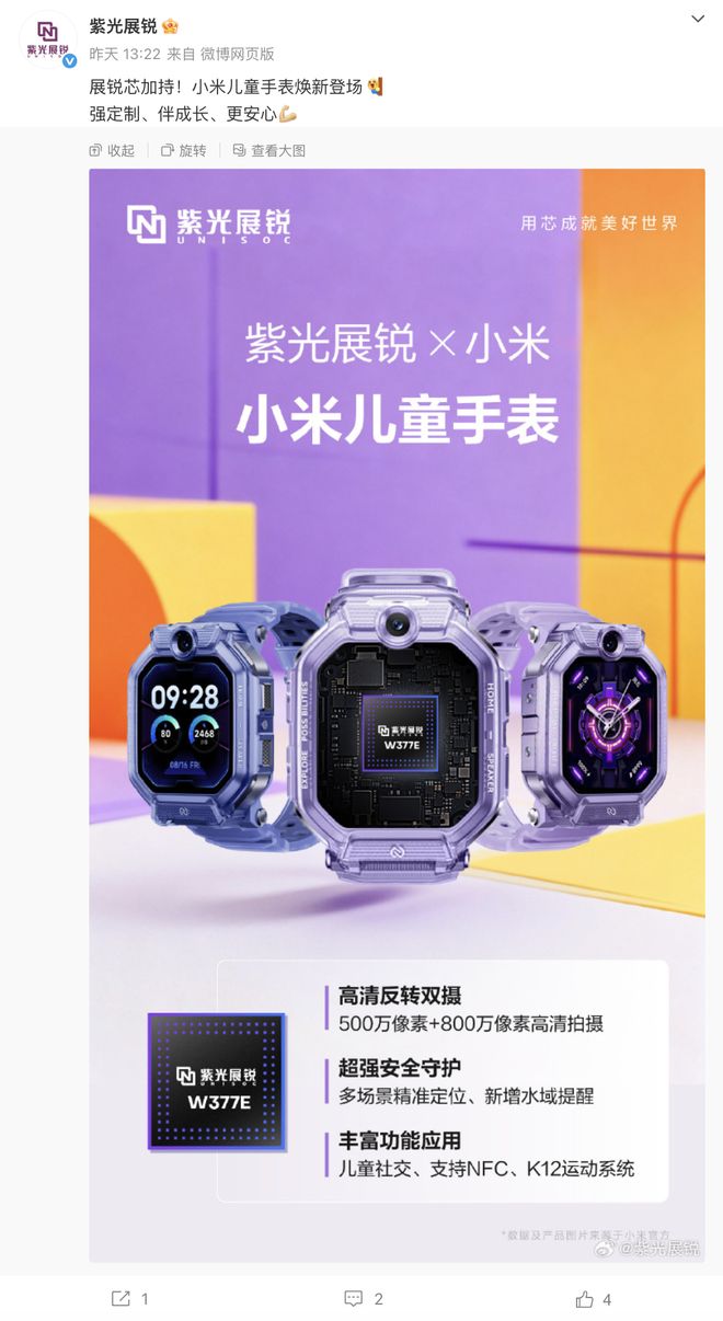 1 月 29 日消息,紫光展锐官方微博发文,“认领”了小米儿童手表,该机在展锐 W377E 芯片的加持下,实现了 5MP + 8MP 反转双摄、NFC、K12 运动系统等特性。