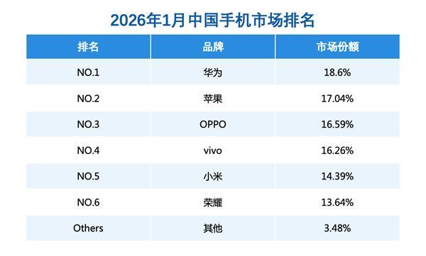 2月2日消息,根据权威机构公布的第三方销量数据,华为领跑新年手机市场,拿到1月份中国手机市场份额第一名,市场份额提升至18.6%。