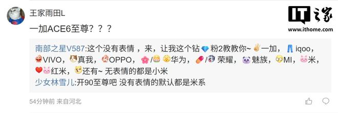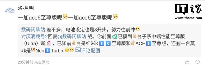 后续有用户在评论区询问:“一加 ace6 至尊版呢 [狗头斜眼] 一加 ace6 至尊版呢 [狗头斜眼]”,博主回复道:“差不多,电池设定也是 8 开头,努力往前冲 [狗头斜眼]”;另一名用户则询问道:“有小长焦吗?还是跟上一代一样大底主摄 [狗头斜眼]”,博主则回复道:“能扫码就算成功 [狗头斜眼]”。