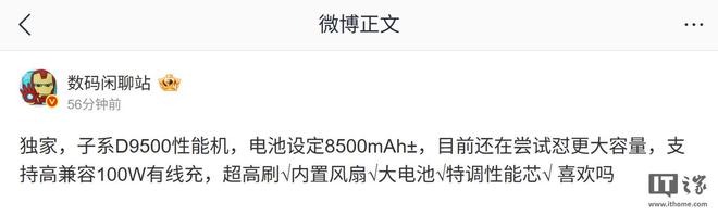 2 月 3 日消息,博主 @数码闲聊站 今天在微博透露,某厂的子系天玑 9500 性能机设定 8500mAh± 电池。