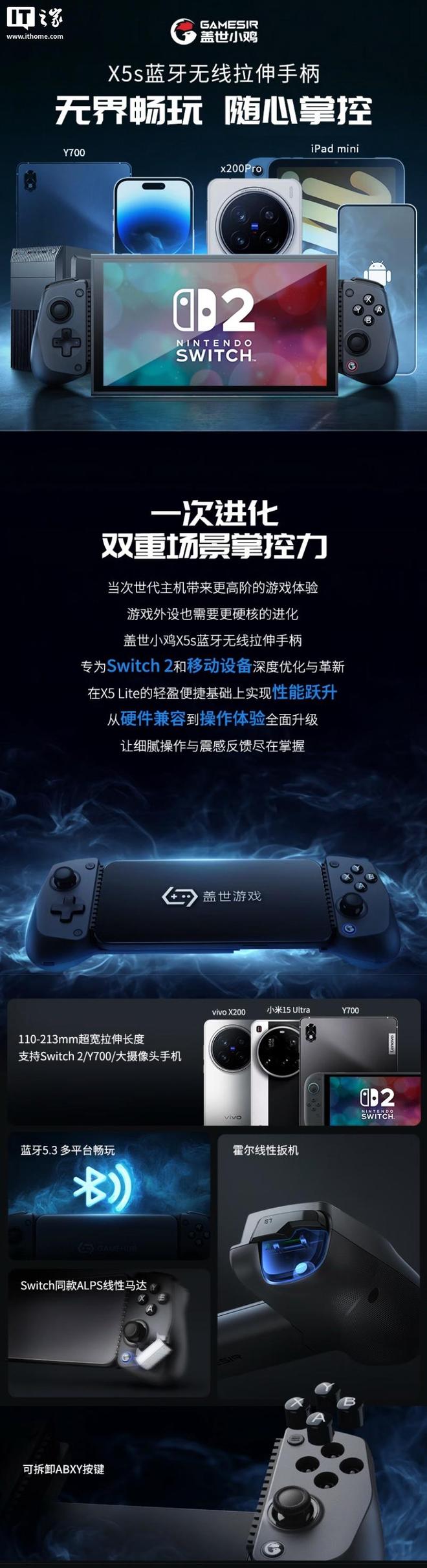 另外,小鸡 X5s 手柄发布于去年 6 月,是一款无线拉伸手柄,采用可拆换 Xbox 布局,配备任天堂 Switch 同款 ALPS 线性马达,拥有 HD 震动体感,定价为 269 元。