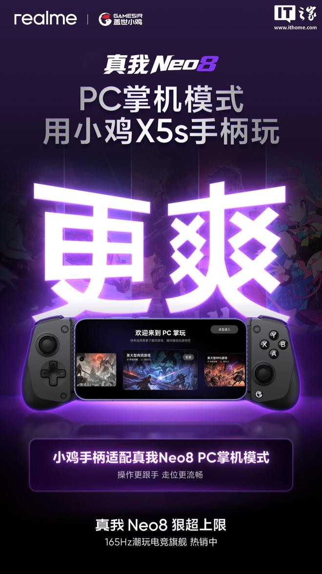 2 月 3 日消息,真我手机官方今日宣布,realme 与 GameSir 盖世小鸡“配对成功”,小鸡 X5s 手柄成功适配真我 Neo8 手机的 PC 掌机模式,可提供更跟手的操作。