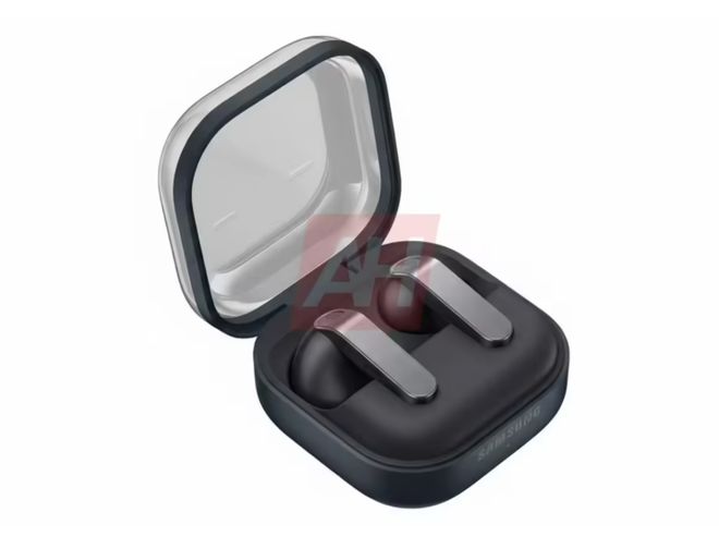 根据渲染图来看,三星Galaxy Buds 4采用了方形的充电盒设计,充电盒盖子为透明设计,在充电盒正面印有三星的logo。细节方面来看,耳机柄内侧均设有连接触点。