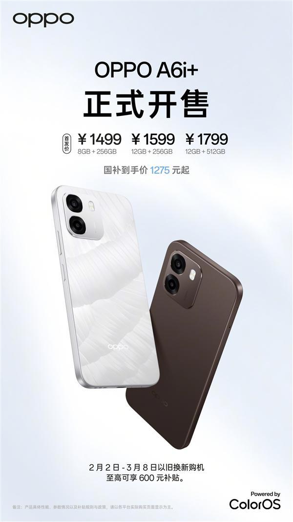 2月6日消息,OPPO A6i+今天正式开售,官方定价是1499元起,国补到手价只要1275元起。