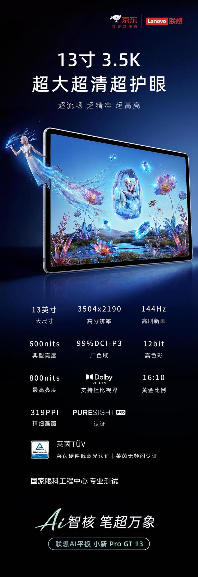 IT之家注意到,小新 Pro GT 13 的具体屏幕参数为 13 英寸 3504×2190 (16:10) 分辨率 144Hz 刷新率 319PPI 像素密度,典型亮度 600nits、最高亮度 800nits,拥有 12bit 色深、99% DCI-P3 色域,支持杜比视界格式 HDR 内容,获得 PureSight Pro 认证、莱茵 TÜV 硬件低蓝光与无屏闪认证,通过国家眼科工程中心专业测试。