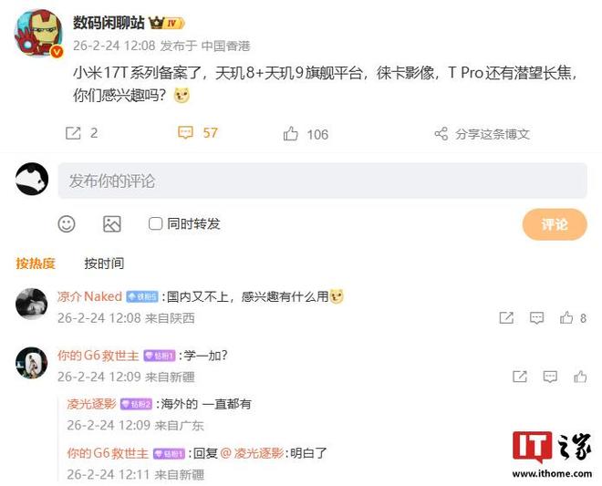 2 月 24 日消息,博主 @数码闲聊站 今日发文透露,小米 17T 系列已备案,新机采用天玑 8 + 天玑 9 旗舰平台,有徕卡影像加持,其中 T Pro 还有潜望长焦。