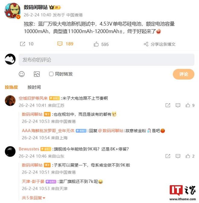 2 月 24 日消息,博主 @数码闲聊站 今日发文透露,蓝厂(vivo)万级大电池新机测试中,采用 4.53V 单电芯硅电池,额定电池容量 10000mAh,典型值为 11000mAh-12000mAh±。