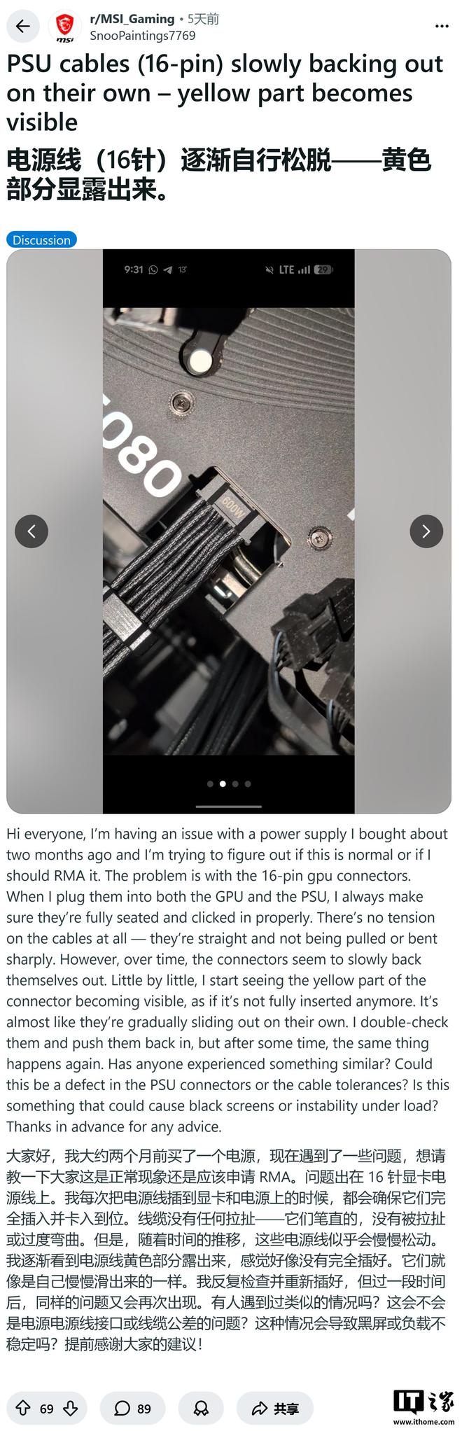2 月 24 日消息,科技媒体 Wccftech 于 2 月 22 日发布博文,报道称多位网友在 Reddit 社区发帖,报告称微星(MSI)的“黄端 16 针电源接口”在使用中会自行缓慢滑出,大幅增加显卡烧熔风险。