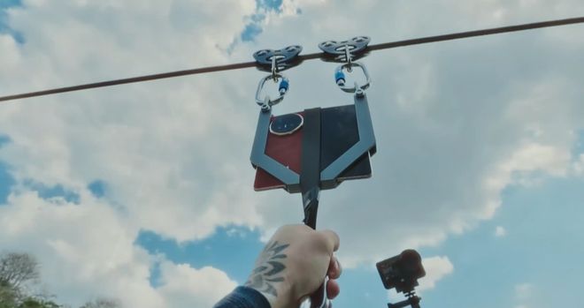 视频中,全球头部挑战博主 JOE WELLER 进行了折叠屏滑索载人挑战。他先是用背包挑战了 25kg 的重量,又用箱子挑战了 50kg 的重量,最后他本人利用 Magic V6 折叠屏手机挑战了 80kg 的滑索载人,完成后顺利开机。