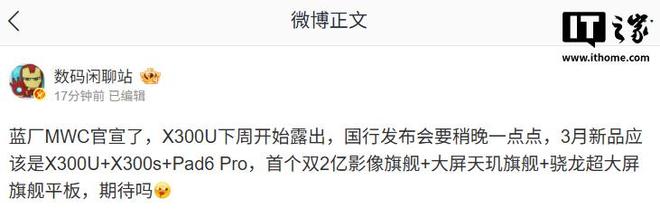 2 月 28 日消息,vivo X300 Ultra 下周将在巴塞罗那 MWC 2026 首次亮相,定位影像旗舰。博主 @数码闲聊站 今日透露“国行发布会要稍晚一点点”,并曝光了 vivo 三月新品阵容。