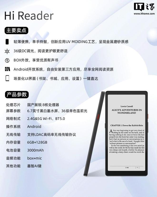 Hi Reader 2026 特别纪念版搭载 6.7 英寸 300PPI 护眼墨水屏,拥有 84% 屏占比,重量 177 克、厚度 7.5 毫米。