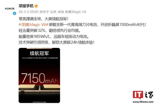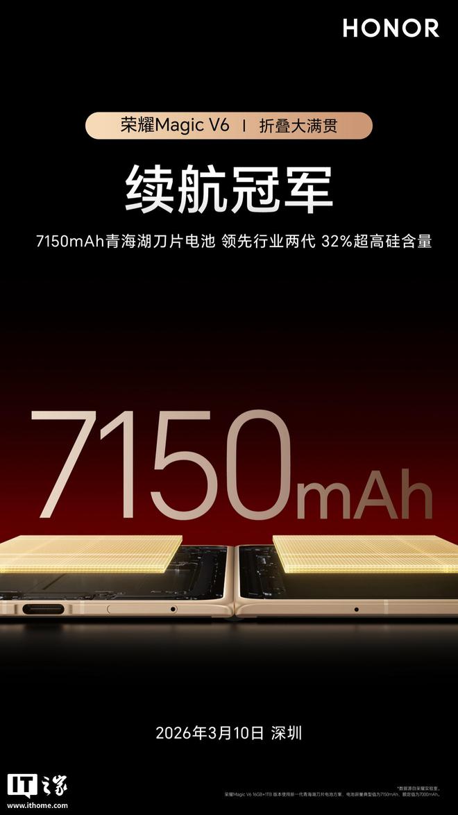 3 月 2 日消息,荣耀手机官方今日宣布,Magic V6 装载全新一代 7150mAh 青海湖刀片电池,宣称“开启折叠屏 7000mAh 时代”。