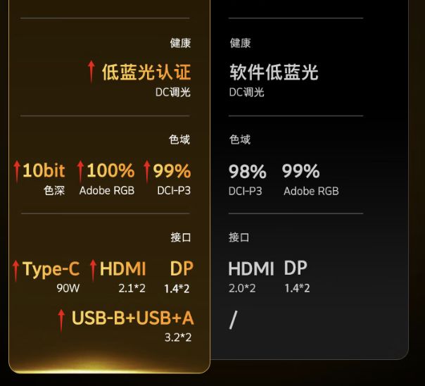 此外,这款显示器支持 10bit 色深,覆盖 100% Adobe RGB 以及 99% DCI-P3 色域,带有 90WType-C 接口、两个 HDMI 2.1 接口、两个 DP1.4 接口等。