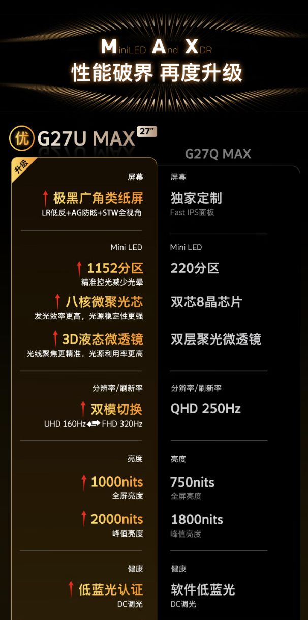 规格方面,这款显示器支持 4K 160Hz/1080P 320Hz 双模切换,方便玩家在 3A 游戏 / FPS 竞技游戏之间切换,全局亮度可达 1000 尼特,峰值亮度 2000 尼特,支持 DC 调光,拥有低蓝光认证。