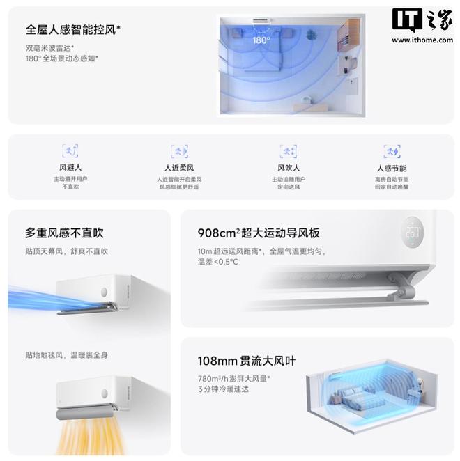 该空调提供双毫米波雷达,主打全屋人感智能控风,可实现 180 度全场景动态感知,实现“风避人、人近柔风、风吹人、人感节能”等智能体验。