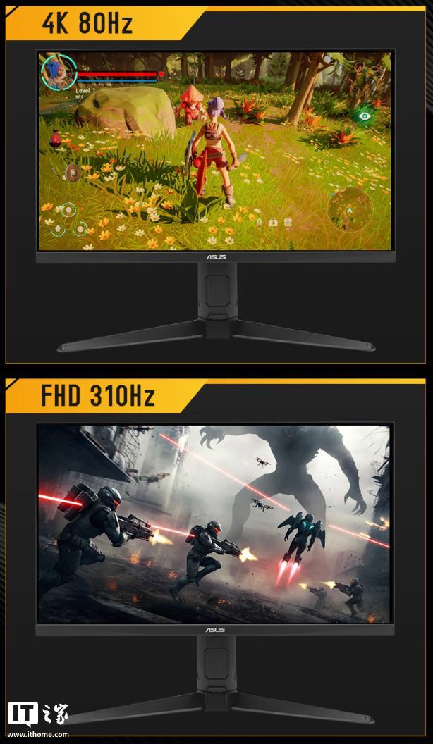 该机配备的 Fast IPS 面板支持以 3840x2160 分辨率 80Hz 或 1920x1080 分辨率 310Hz 显示,其 GtG 响应时间低至 0.3ms,亮度 400nits,对比度 1000:1,色域容积 120% sRGB。