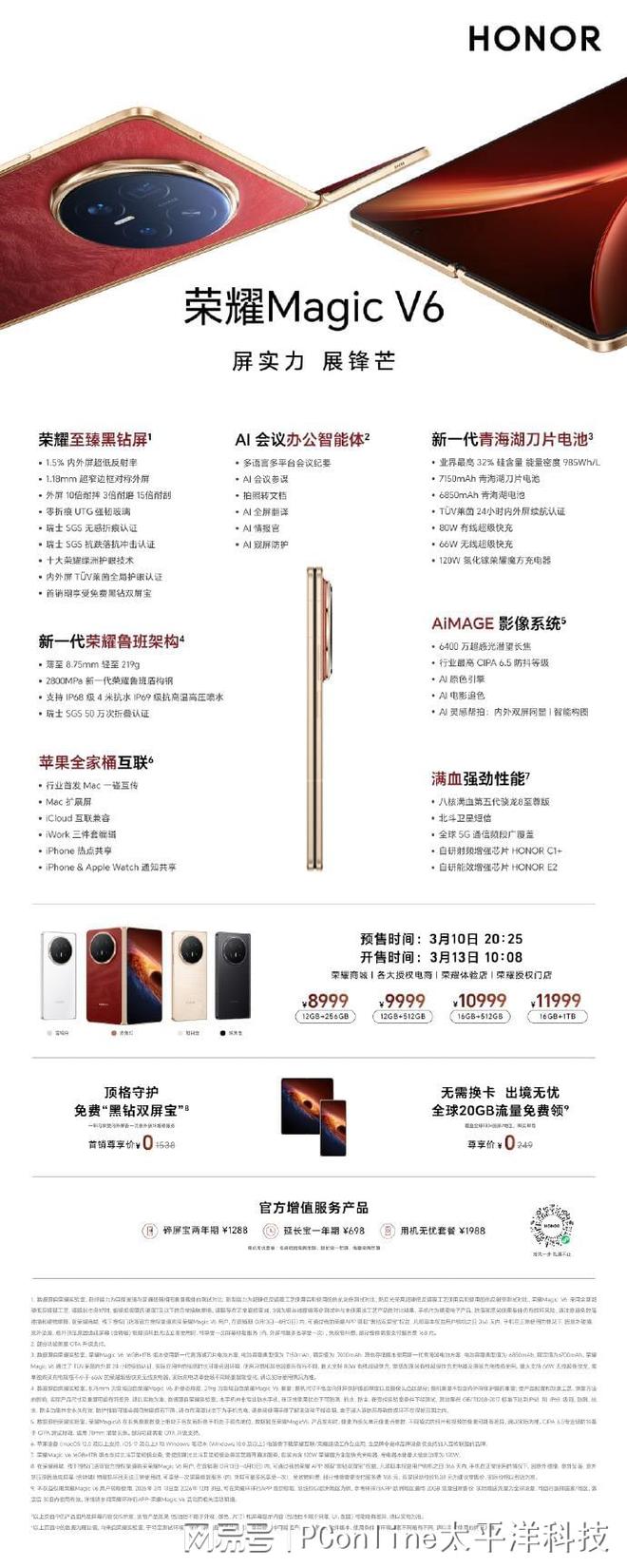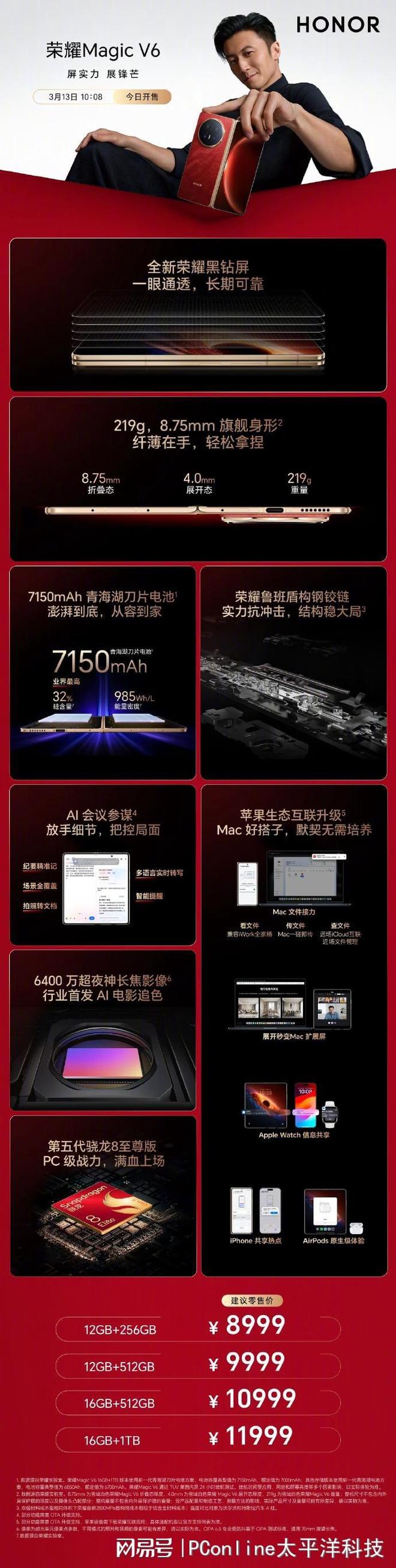 续航也是该机的一大亮点。荣耀Magic V6内置6850mAh青海湖电池,而1TB版本则升级为7150mAh新一代青海湖刀片电池,支持80W有线快充和66W无线快充。此外,新机还搭载自研2800Mpa鲁班盾构钢铰链结构,支持多角度悬停,并具备IP68与IP69级防尘防水能力。系统方面运行MagicOS 10,并加入AI会议等智能生产力功能。