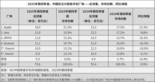 IDC数据显示,2025年第四季度,vivo出货量在中国品牌中位居第一,且在sale out实际零售数据中连续两年保持领先。vivo X300系列和iQOO 15系列双旗舰齐发,帮助vivo在600美元以上高端市场稳居国产前三,同时依靠S系列和iQOO在主流价位段保持市场竞争力。