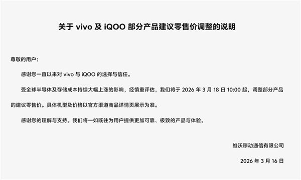3月16日消息,继OPPO之后,今日vivo在其官网发布《关于vivo及iQOO部分产品建议零售价调整的说明》,宣布将于3月18日10点起,调整部分产品的建议零售价。以下是全文: