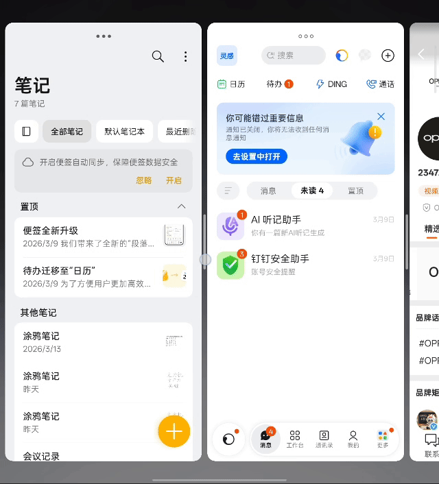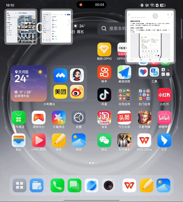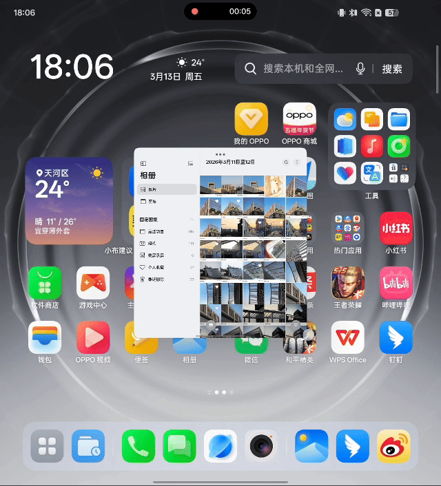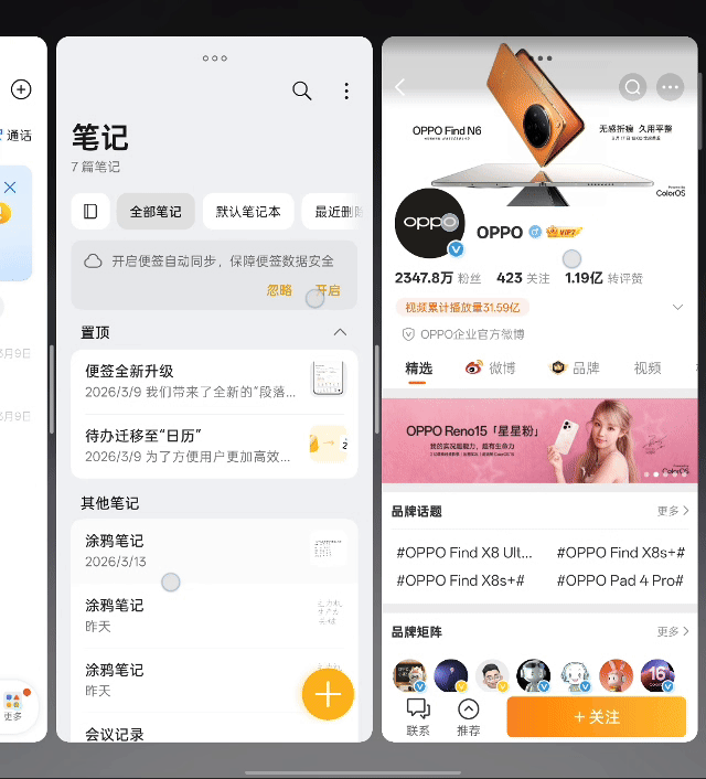 以往折叠屏的“分屏”体验,更像是一种受限的妥协。你被固定在几个预设的布局中,应用之间是孤岛,拖拽分享时常失灵,多个任务并行时,管理浮窗本身就成了另一项负担。而OPPOFind N6的全景自由窗,第一次让我感觉折叠屏的交互逻辑,从“手机思维”跃迁到了“桌面级OS思维”。