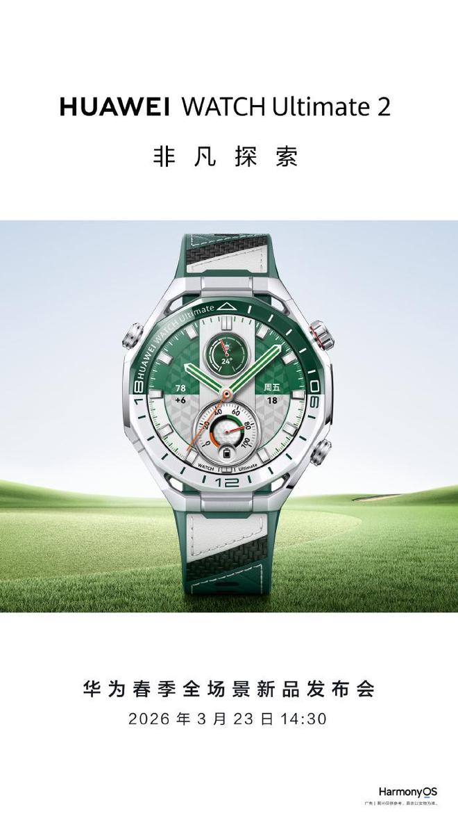 3 月 19 日消息,华为今日官宣,华为 WATCH Ultimate 2 非凡探索手表“旷野绿”3 月 20 日 10:08 开启预售,3 月 23 日华为春季全场景新品发布会,不见不散。