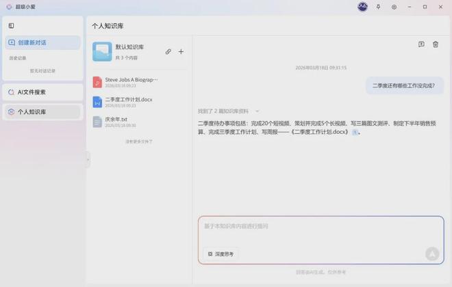 我现在已经习惯把需要记录的文件都上传给小爱的个人知识库,系统会识别并记忆这些内容,之后就能针对这些内容进行深度问答,想找什么文件,直接用大白话告诉小爱就行,大大提升了学习和工作效率。