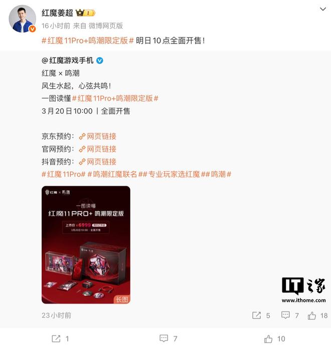 3 月 20 日消息,努比亚红魔 11Pro+ 鸣潮限定版手机于上月发售,不过后续产品迅速售罄。对此,红魔游戏手机产品总经理姜超称该机将于今天 10:00 开启新一轮发售。