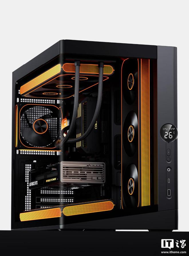 该机箱采用一体式曲面玻璃结构,整体尺寸为 410 x 275 x 454mm,正面配备一块 LED 数显屏,支持显示 CPU 温度等信息;机箱顶部及背面采用金属网孔设计,底部采用斜切风扇位,可在优化散热的同时让视觉观感更通透。机箱正面提供了 1 个 3.5mm 音频接口、1 个 USB-C 接口、1 个 USB-A 3.0 接口。