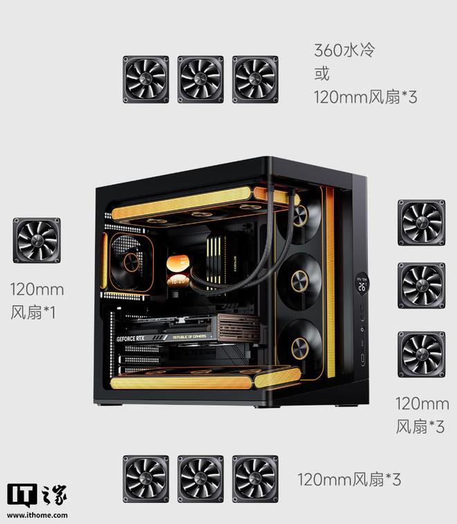 该机箱兼容 ATX / M-ATX / ITX 主板,显卡长度限 415mm 以内,风冷限高 160mm,最多可容纳 1 块 2.5 英寸 + 2 块 3.5 英寸硬盘。机箱最多可安装 10 把风扇,其中机箱顶部可安装 3 把 120mm 风扇,兼容 360 水冷;机箱背面可安装 1 把 120mm 风扇;机箱正面可安装 3 把 120mm 风扇,机箱底部可安装 3 把 120mm 风扇。